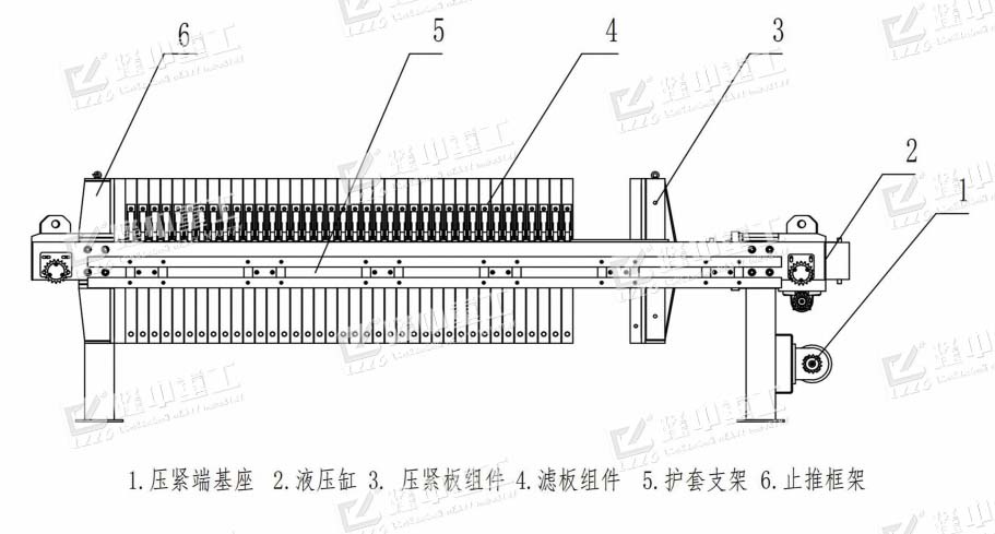 廂式壓濾機(jī)是通過濾板的擠壓,使污泥內(nèi)的水通過濾布排出,從而達(dá)到脫水目的。也稱進(jìn)漿脫水,即一定數(shù)量的濾板在強(qiáng)機(jī)械力的作用下被緊密排成一列,濾板面和濾板面之間形成濾室,過濾物料在強(qiáng)大的正壓下被送入濾室,進(jìn)入濾室的過濾物料其固體部分被過濾介質(zhì)(如濾布)截留形成濾餅,液體部分透過過濾介質(zhì)而排出濾室,從而達(dá)到固液分離的目的。